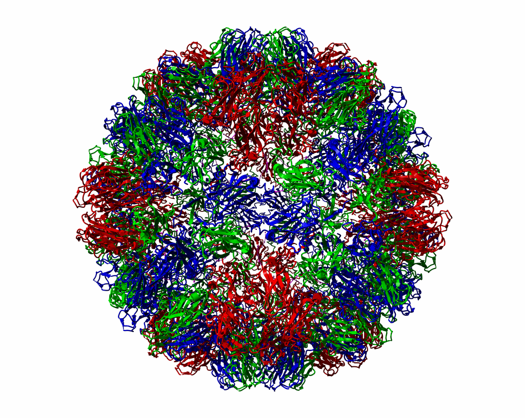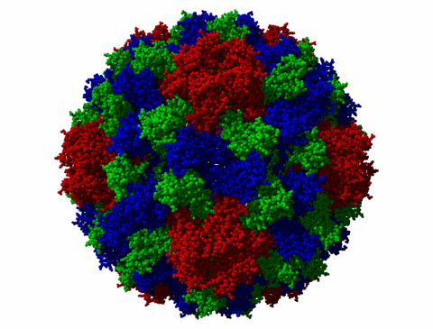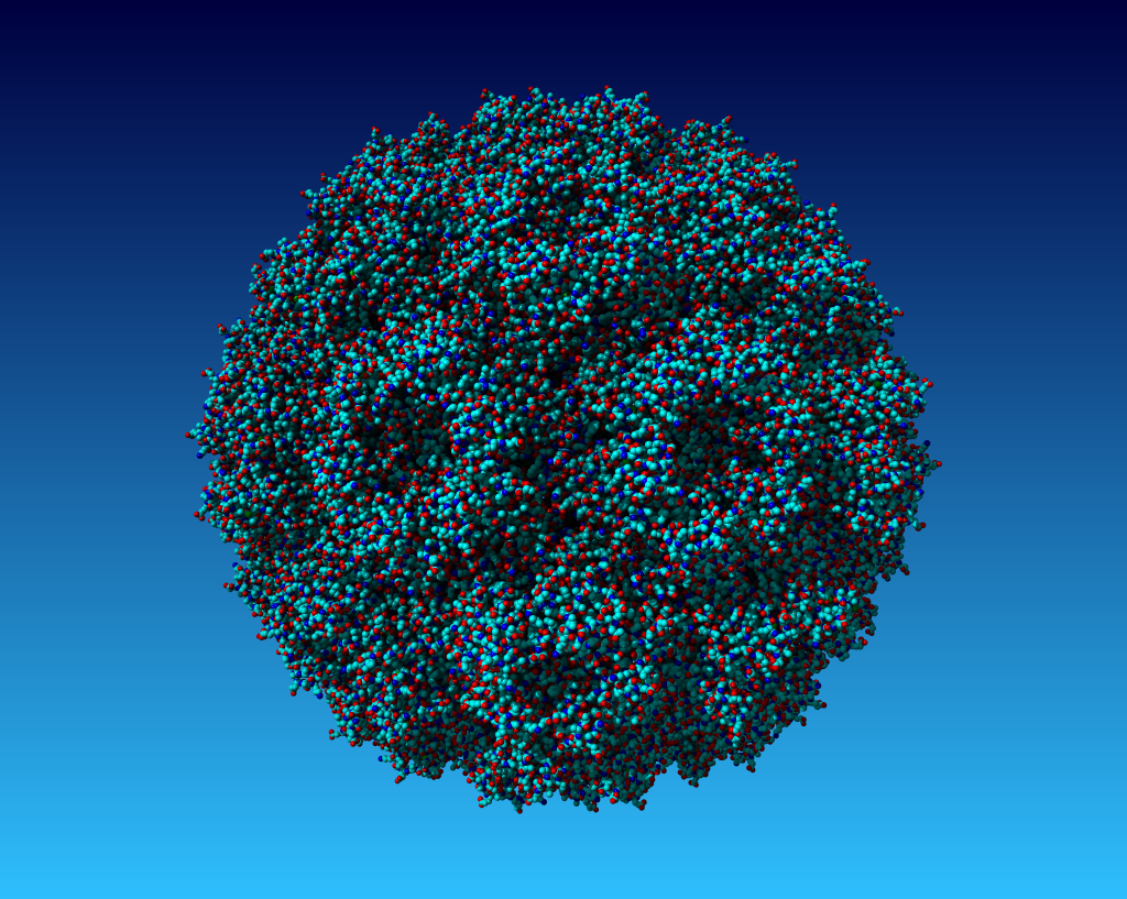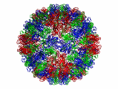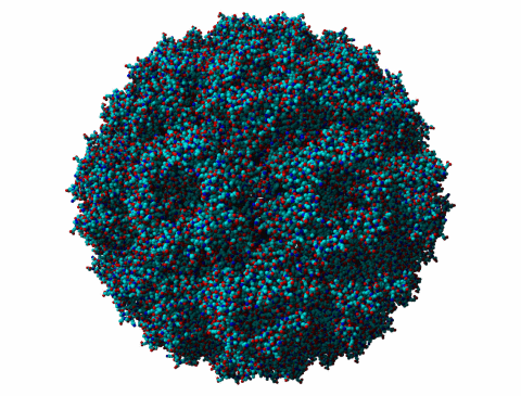 Lets first give some CCMV figures to illustrate what it looks like. In each case you can click on the figure to make it rotate. The first picture is just an all-atom model looked at from some 300 Ångstrøm distance.