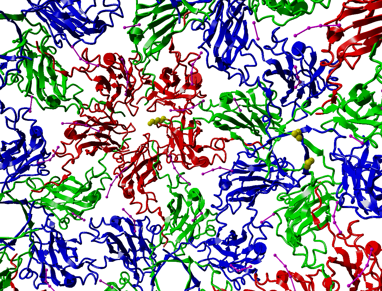 Something funny. If we look at the three C-termini, we see that the Ntermini of the green and blue units are very close to each other, but the N-termini of the red chains, that cluster around the 5-fold axis, are far away from the other two. When we were doing NMR on this virus in the early 80's, we never understood why the NMR signal for the N-termini was 'less than expected'. Now we know at least how to start thinking about this point.