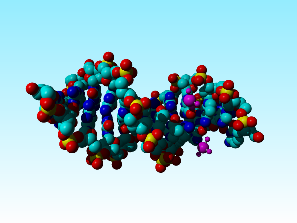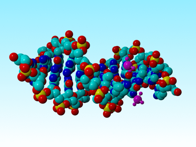 The PDB file 5bna. Waters were removed. The cisplatins are in purple. This picture is also available rotating around the horizontal axis. |