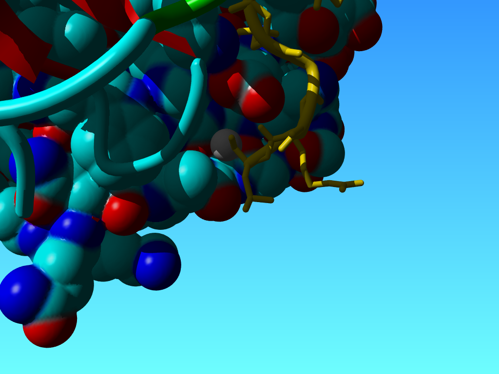 The molecular surface shown on the B chain. The C-chain in yellow. The U at the C-terminal end of the C-chain is shown as a gray ball. |